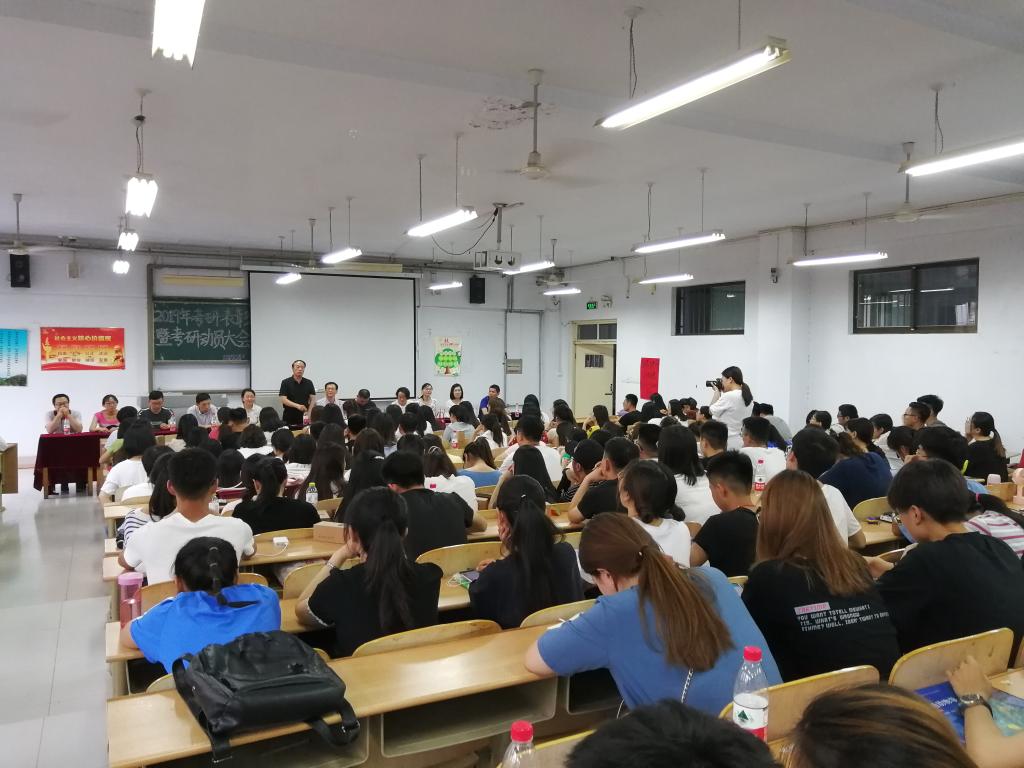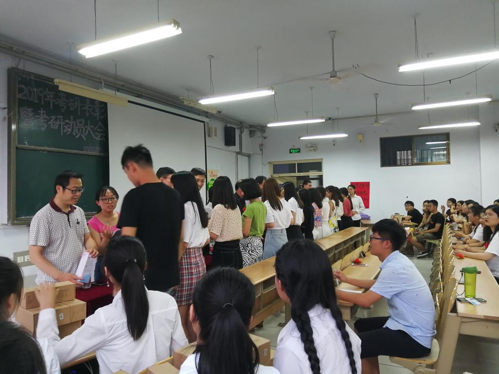 本次大会共有七项议程。第一项魏院长宣读2019届考研学生录取名单;第二项领导老师为2019届考研同学颁奖;第三项考研学生代表胡冉发言,感谢母校四年来的栽培,感谢领导老师四年来的教导,表示将会秉承母校校训,在新的平台上更好的发展;第四项考研接力旗转接仪式,希望在下一年的考研大战中,欧美亚州国产日韩mv天天能取得更加辉煌的成就;第五项2020届学生代表王乐兵发言,表示将拿出不畏严寒酷暑的毅力和劈荆斩棘的勇气,以最饱满的热情和斗志,努力拼搏,奋勇向前,去取得考研的胜利,实现人生的跨越;第六项院长曾强成讲话,向毕业生送去祝贺,希望他们能更上一个台阶;第七项党总支书记焦德杰讲话,给大家提出了殷切的期望,大家都受益匪浅。