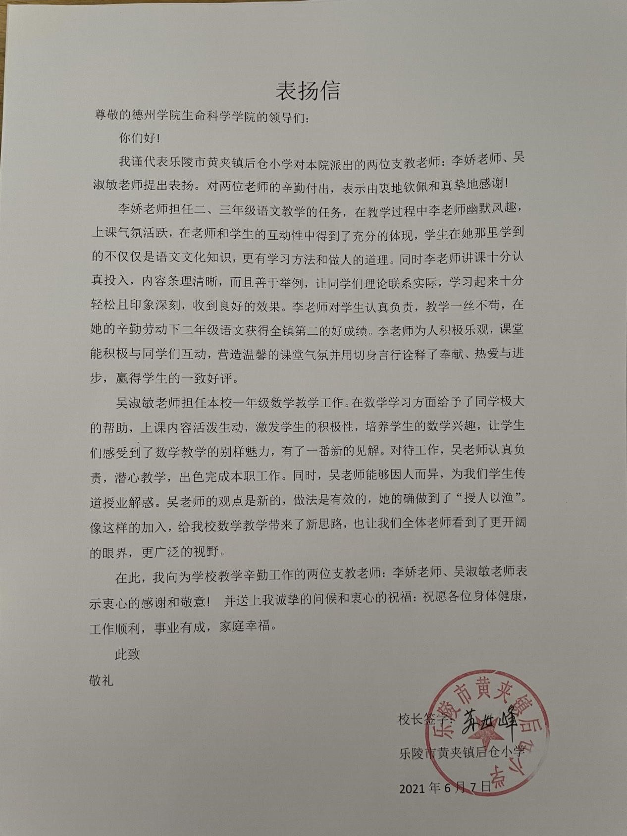 2021年6月7日,欧美亚州国产日韩mv天天2018级生物科学本科班李娇、吴淑敏两位同学因在支教期间表现优异,得到支教学校的认可,受到乐陵市黄夹镇后仓小学校领导高度赞扬。