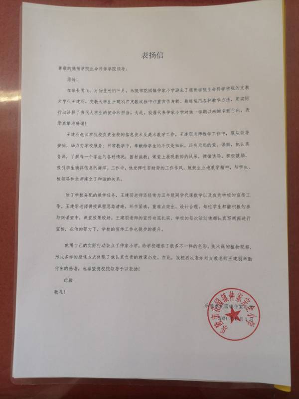 2021年6月1日,欧美亚州国产日韩mv天天2018级生物科学本科班王建羽同学因在支教期间表现突出,受到了支教学校乐陵市花园镇仲家小学的表扬。