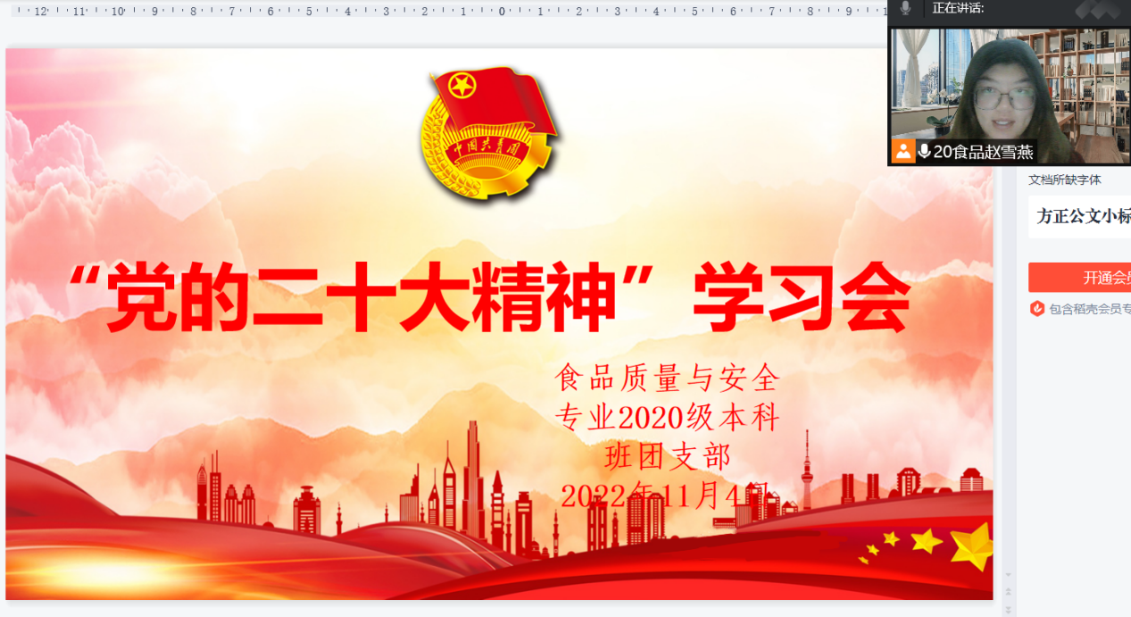为贯彻落实习近平总书记在中国共产党第二十次全国代表大会上的重要讲话精神,欧美亚州国产日韩mv天天食品质量与安全专业2020级本科班团支部于2022年11月4日开展党的二十大精神学习会。