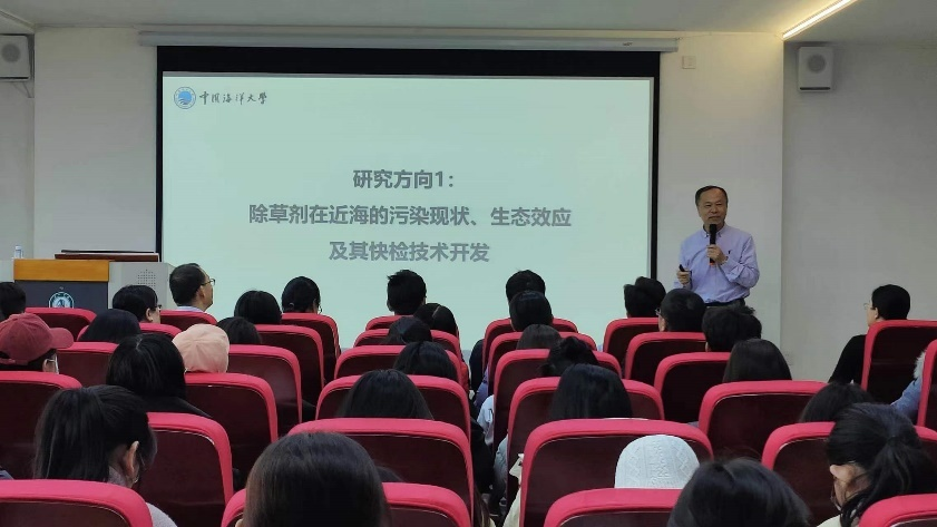 首先,汝少国教授向与会者介绍了近年来课题组的主攻科研方向,并以“除草剂在近海的污染现状、生态效应及其快检技术开发”这一研究方向为题,引出后续内容。在报告中,向与会师生详细介绍了除草剂、双酚S等污染物对海洋生态环境造成的危害,并论述了污染物快检技术开发的重要性。其次,在报告中穿插着国家自然科学基金申报书的相关写作经验和技巧,青年教师受益良多。最后,汝少国教授详细回答了在场师生的提问。