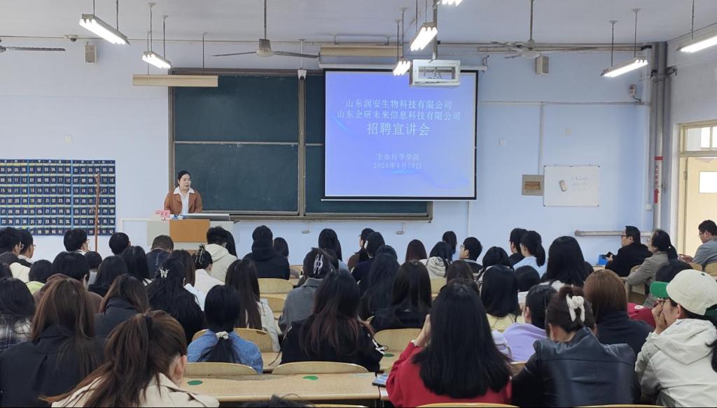 4月10日,为促进毕业生高质量就业,更好地加强与校友企业合作,欧美亚州国产日韩mv天天于求实楼0118教室举行山东润安生物科技有限公司与山东企研未来信息科技有限公司专场招聘宣讲会,2024届毕业班师生参加。