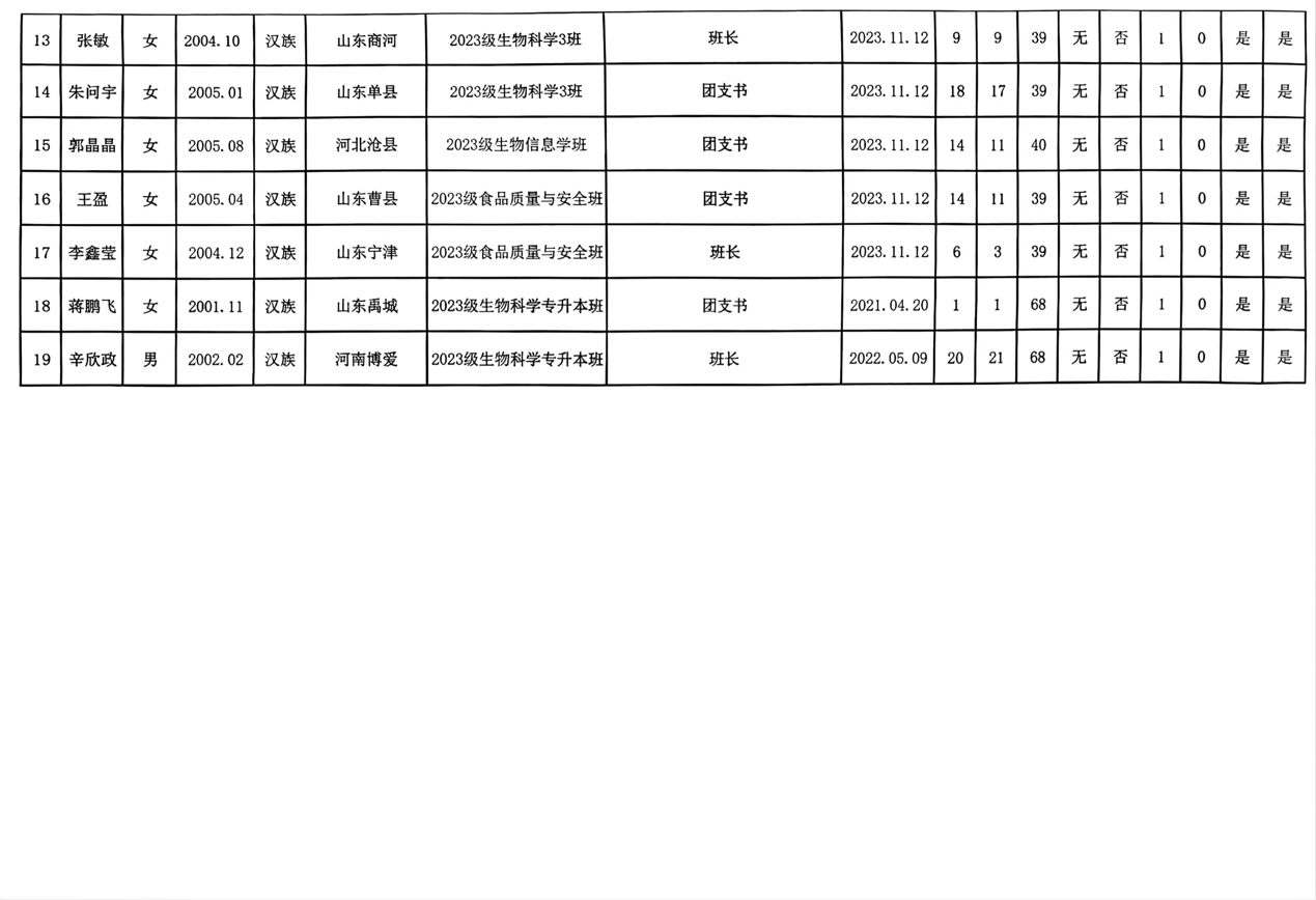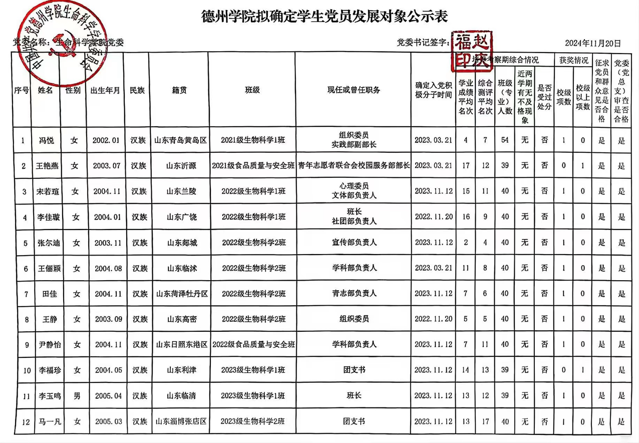 经党组织培养考察,征求党员、群众和培养联系人意见,支委会讨论研究、党委审查,拟确定冯悦等19人为党员发展对象。为增强发展党员工作的透明度,接受党内外群众的监督,确保发展党员的质量,根据上级文件精神和《中共德州学院委员会发展党员工作实施细则》的要求,现将拟确定发展对象的基本情况公示如下(详见附表):