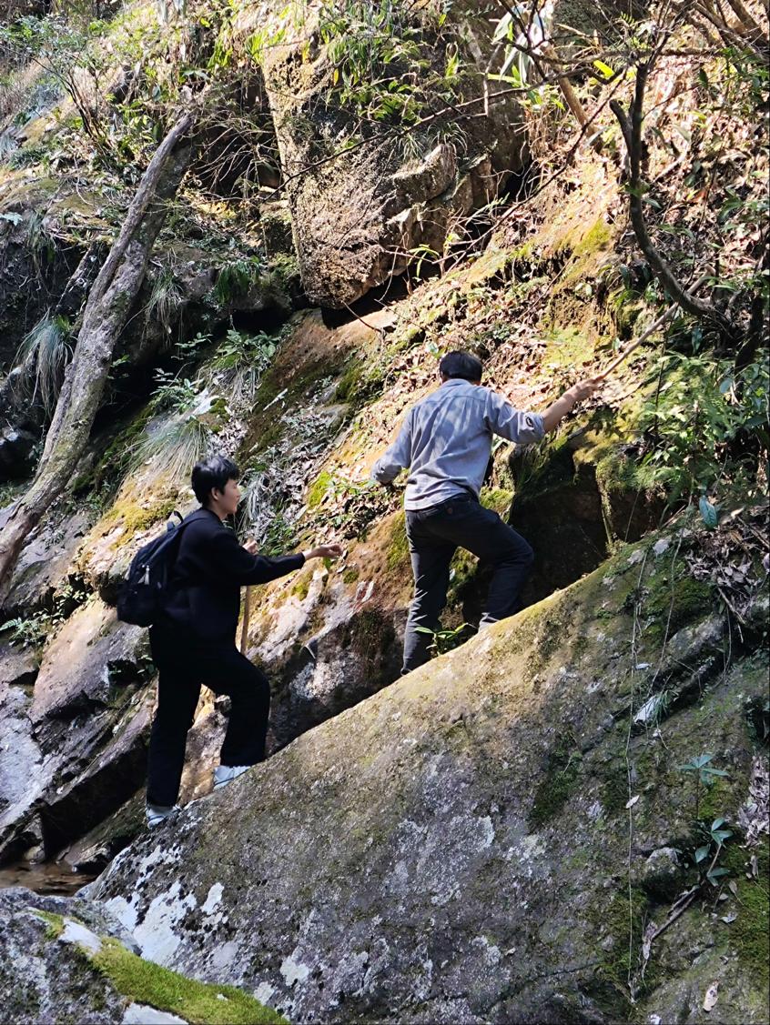 3 月 24 日,石潭村错落有致的梯田上,带队老师详细讲解植物标本采集的流程。同学们分组行动,认真观察每一株植物的形态、颜色,仔细辨认植物种类,并用记录本详细记录植物的叶片形状、花朵特征、生长环境等信息。在齐云山,山间云雾缭绕,带队老师结合独特的地质地貌,讲述植物与环境相互依存的关系。同学们一边聆听,一边对照手中的植物图鉴,探索植物适应环境的奥秘。
