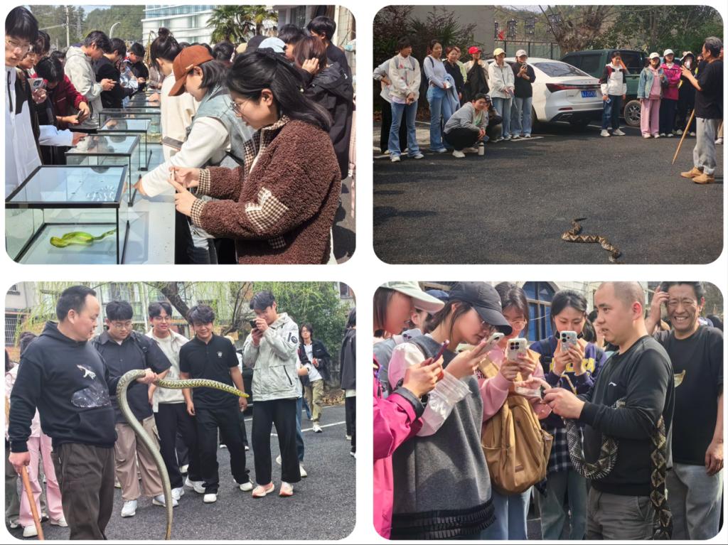 3 月 23 日,宏村如诗如画的田园风光中,指导教师俯身于花草之间,亲手演示标本采集的规范操作。同学们目光如炬,手持专业采集工具,有条不紊地采集植物样本。遇到形态特殊或难以辨别的植株,便围聚在一起,借助植物图鉴与手机查阅资料,开展热烈讨论。在昆虫活动频繁的草丛,大家依据所学昆虫习性知识,轻手轻脚地布置陷阱。下午,师生们来到屯溪蛇园。在繁育区,同学们好奇地观察着蛇蛋孵化的过程,听饲养员讲述蛇类繁殖的奥秘;展示区内,形态各异的蛇类标本和活体蛇,吸引着同学们的目光。部分胆大的同学,在专业人员的指导下,亲手触摸温顺的蛇类,真切感受到蛇类独特的体表特征,对蛇类生态有了直观认识。