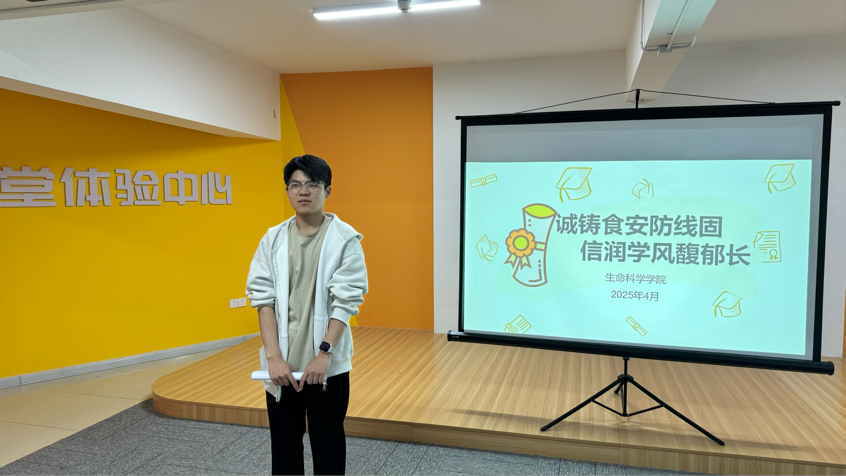 4 月 14 日下午,欧美亚州国产日韩mv天天 2024 级食品质量与安全二班于博文楼六楼开展了 “诚铸食安防线固,信润学风馥郁长” 诚信教育主题班会,此次班会作为 “共同上一堂诚信主题思政大课” 的重要一环,以深度交互为核心,通过 “专业案例重现 + 诚信理念渗透” 相结合的方式,构建起 “感悟型” 的主题班会新模式,将诚信教育巧妙嵌入学生的职业规划与学术探索,助力专业认知深化,积极营造浓厚的优良学风氛围 。