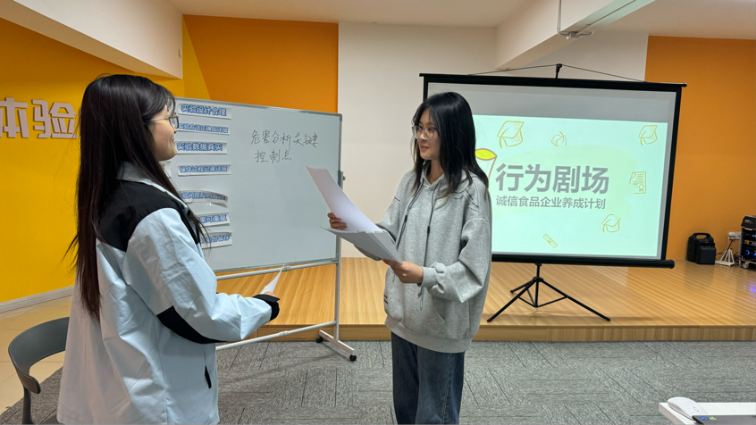 “诚信食品企业养成计划”将班会推向高潮。学生们通过角色扮演,演绎了一场食品加工厂从使用劣质食材、违规质检放行、虚假宣传上市到最终被媒体曝光陷入危机的故事。逼真的表演让学生们切实体会到不诚信行为带来的严重后果,引发大家对食品安全与诚信关系的深入思考。