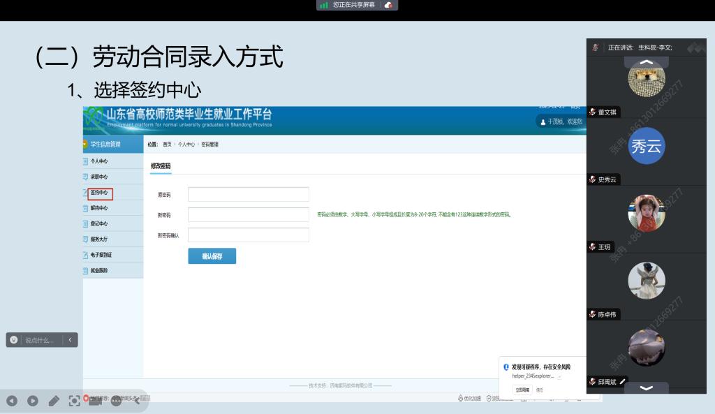 会议伊始,辅导员孙珍辉老师分析了当下的就业形势,讲述了西部计划的相关内容,包括优惠政策、就业途径等。此外,会议还提到了征兵的优惠政策,如学费补偿、免试考研等,强调了关注相关公众号的重要性,以便及时获取就业信息和企业招聘信息。我院创业就业部负责人详细讲解了如何登录山东省教育厅高校毕业生就业网,填写个人信息、上传证明材料等步骤,针对不同就业类型,包括升学、灵活就业、网签、劳动合同等的录入相关事宜进行重点解读。