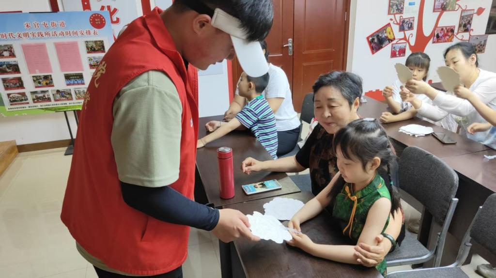 (志愿者与小朋友共同绘制彩扇)
