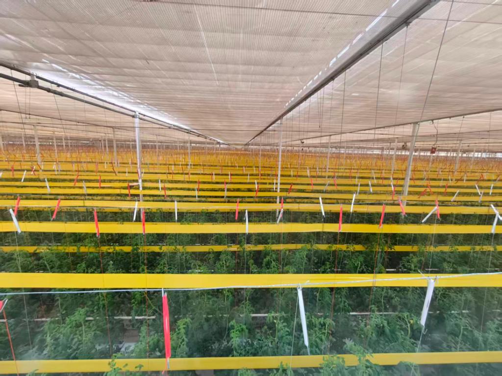 在园区技术专家的带领下,同学们深入参观了核心区域——番茄智慧园。放眼望去,并非传统的土壤垄沟,而是一排排整齐的立体栽培架,番茄植株生长在精准配比的营养液中,环境温湿光照皆由智能系统自动调控。技术人员系统讲解了无土栽培的技术原理、水肥一体化系统的运作以及熊蜂生物授粉等关键技术。同学们兴致盎然,认真聆听记录,并围绕智能传感、数据决策、节能增效等话题与专家进行了热烈互动,结合课堂所学提出了诸多有见地的思考,展现了扎实的专业素养和强烈的求知欲。许多同学感慨,亲眼所见的高度自动化生产场景,让他们对“科技赋能农业”有了前所未有的具象理解。