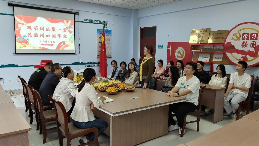 活动伊始,全场肃立,师生同唱国歌。随后,我院老师向同学们致以“双节快乐”的诚挚祝福,特别对来自新疆维吾尔族的少数民族学子表达了牵挂,细致叮嘱大家留校期间的安全事项。从宿舍用电安全到外出报备流程,从饮食健康提醒到应急联络方式,句句叮嘱都饱含对学子的关切,让留校学生深切感受到“在校如在家”的温暖。在接下来的分享中,同学们积极畅聊,或讲述家乡中秋特色习俗,或分享在校学习生活点滴。不同民族的同学在真挚的交流间拉近距离,让民族团结的暖意悄然流淌。活动最后,将提前准备好的月饼、水果分发给每位同学。大家手持象征团圆的月饼,品尝着新鲜水果,在欢声笑语中话家常、谈未来,活动现场充满了团圆的喜悦与集体的温暖。