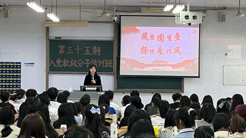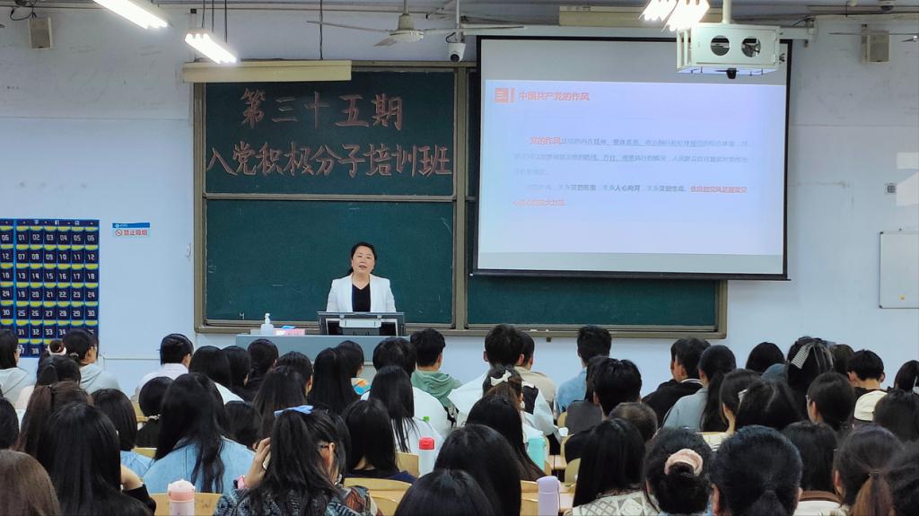 2023年4月18日,为帮助入党积极分子进一步掌握党的知识,保持党组织的先进性和纯洁性,欧美亚州国产日韩mv天天党委副书记夏书珍、第三学生党支部书记孙珍辉同志于求实楼0117教室作“筑坚固堡垒,扬优良作风”主题党课讲座。参训学员共127名。