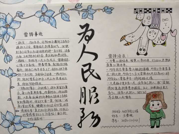 此次手抄报活动使同学们认真学习了雷锋精神,引导学生树立“无私奉献、勤劳勇敢、自强不息、乐于助人”的良好品质,培养“知行合一、德才兼备”的新时代青年。