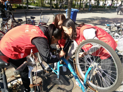 活动现场,志愿小分队们各自忙于各自的任务,给车链上油,给车子上链,扶起倒下的车子,将车子摆放整齐等等。他们互相合作,积极配合其他分队的工作,使活动有条不紊的进行,同时得到了来往同学和老师们的赞扬。