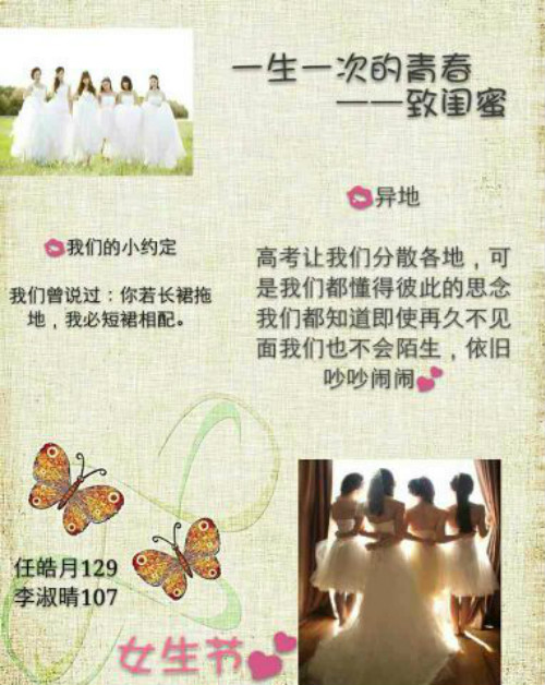 对于女生的祝福采用电子版海报的形式来体现,海报的内容可以是闺蜜间的密语、好友间的温情、朋友间的关爱。通过海报,同学们将平时说不出口的话表达了出来,加深了朋友间的感情。海报内容感情真挚,积极向上,体现出了同学之间的温馨情谊。活动后期,由于报名人数众多,所以经过几天筛选,选出的优秀作品将在欧美亚州国产日韩mv天天微信平台上进行展示,届时便于同学们观看。