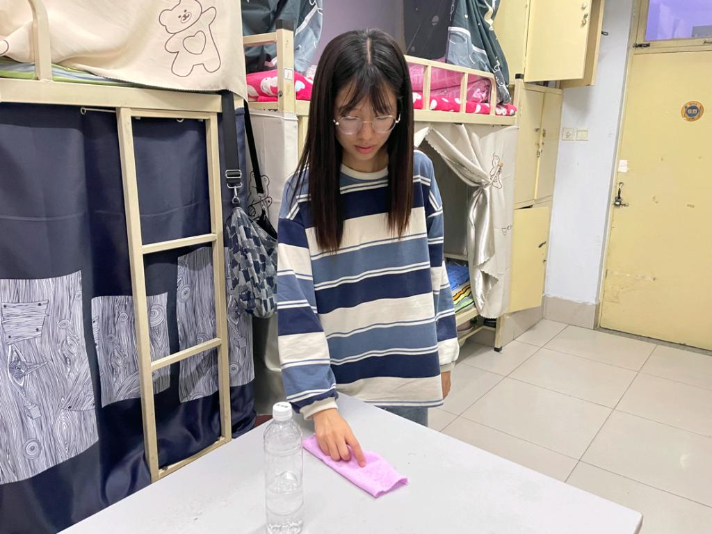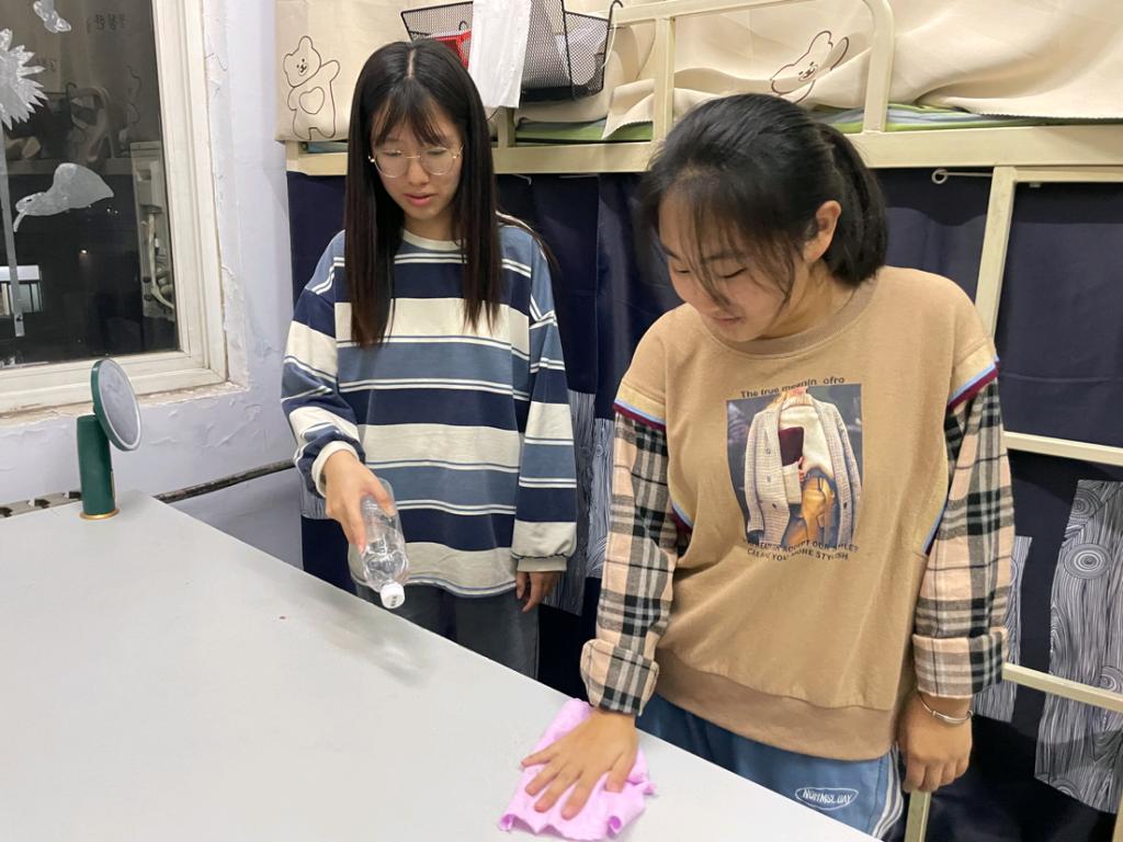 活动伊始,志愿者们按照比例配比消毒液,并分发给宿舍长们。在消毒过程中,同学们分工合作,相互配合,对宿舍地面、阳台、卫生间等区域进行了统一消杀,做到不留死角、不留盲区。此外,志愿者们还对同学们进行了安全卫生宣讲,希望他们能够自觉遵守“每日清洁制度”的规定内容,做到地面每日一扫拖、垃圾每日一倒、加强室内通风等清洁要求,切实提高同学们自身的健康安全意识。
