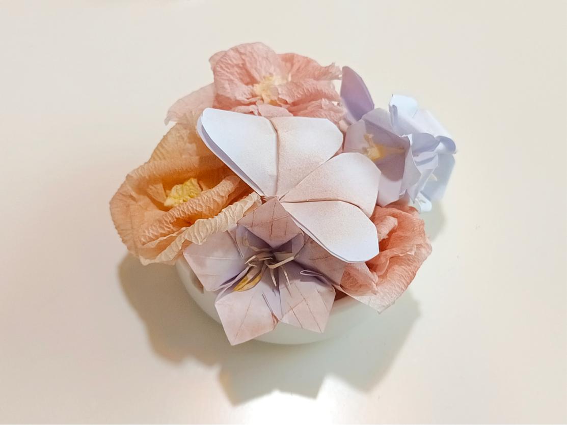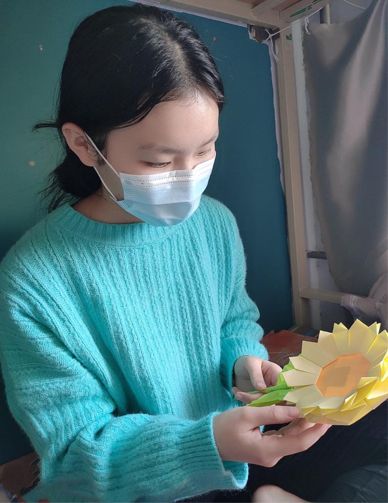 同学们在折纸上写下自己在疫情防控期间的感悟和对志愿者老师辛勤付出的感谢,他们将平面化作立体,以纸张为媒介,充分发挥想象,利用折纸、剪刀、粘胶等材料,将其折成向日葵、玫瑰花、花篮等精美的作品。活动结束后,同学们纷纷表示小小的折纸彰显了他们对传统文化的热爱和抗击疫情的决心,他们要将自己的折纸作品献给在我们身边默默付出的防疫志愿者老师们,相信我们定能携手同心,共抗疫情。
