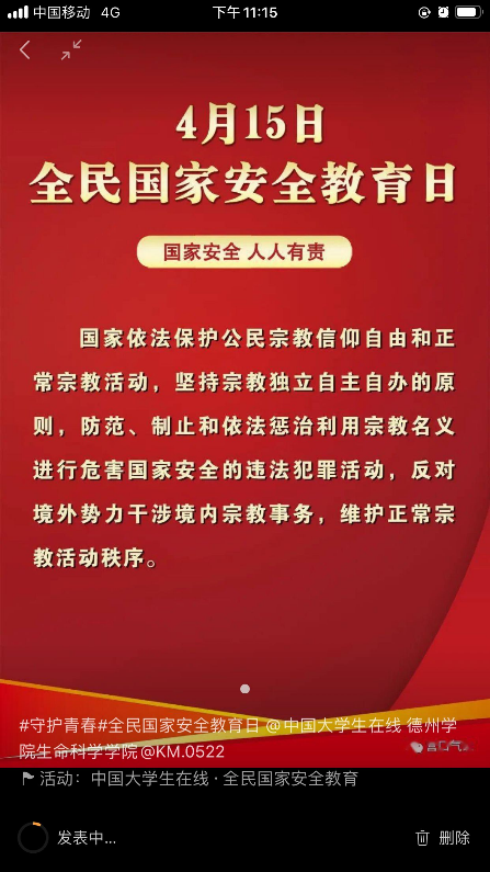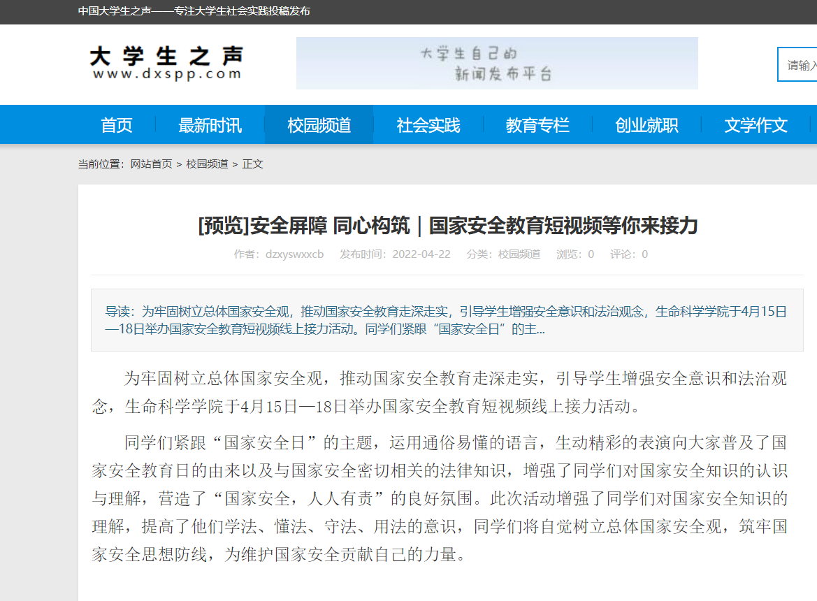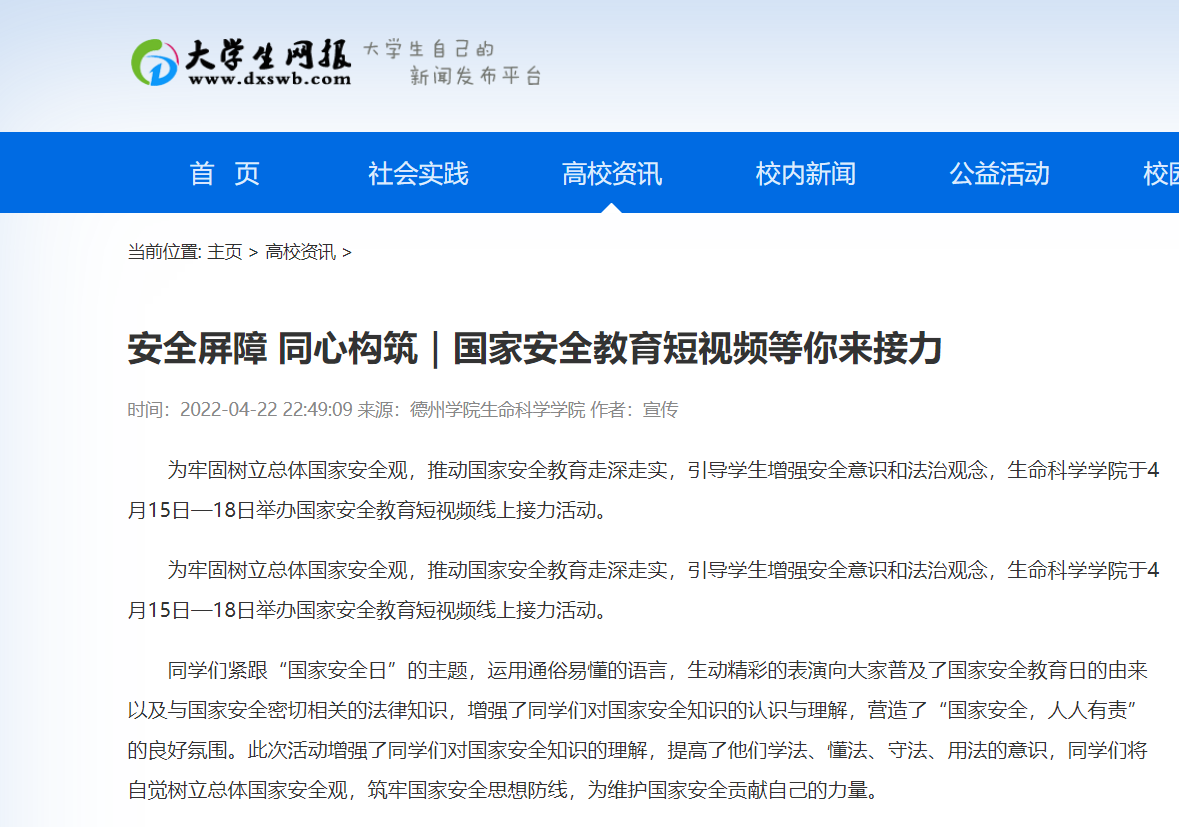 为牢固树立总体国家安全观,推动国家安全教育走深走实,引导学生增强安全意识和法治观念,欧美亚州国产日韩mv天天于4月15日—18日举办国家安全教育短视频线上接力活动。