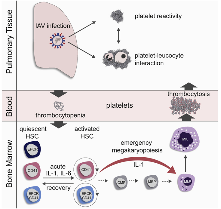 巨核细胞的快速分化过程确实已经被描述为紧急性巨核细胞生成(emergency megakaryopoiesis),这种情形发生在对系统性炎症或感染的反应中。然而,到目前为止,还没有人猜测这与局部病毒性呼吸道疾病有关。尽管小鼠的流感病毒感染仅限于呼吸道,但在受感染小鼠的骨髓中发现细胞因子IL-1和IL-6的水平增加。他们使用两组基因敲除小鼠:一组关闭了IL-1受体,另一组关闭了IL-6受体,发现这两种细胞因子在流感病毒感染期间对造血干细胞的激活和紧急性巨核细胞生成作出了决定性的贡献。