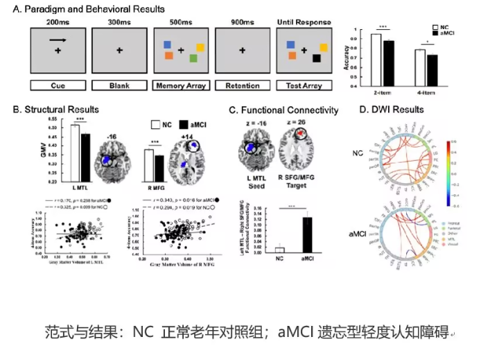 近日,心理学系库逸轩教授团队在《Alzheimers & Dementia》期刊上发表最新研究成果,通过多模态神经影像学技术(包括脑灰质结构成像、白质纤维成像和功能磁共振成像)和认知行为实验,首次揭示了视觉短期记忆在阿尔茨海默病(AD)早期阶段的神经退化与代偿机制。