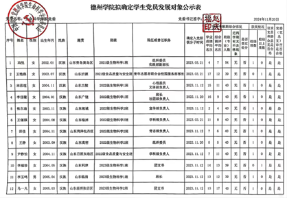 经党组织培养考察,征求党员、群众和培养联系人意见,支委会讨论研究、党委审查,拟确定冯悦等19人为党员发展对象。为增强发展党员工作的透明度,接受党内外群众的监督,确保发展党员的质量,根据上级文件精神和《中共德州学院委员会发展党员工作实施细则》的要求,现将拟确定发展对象的基本情况公示如下(详见附表):