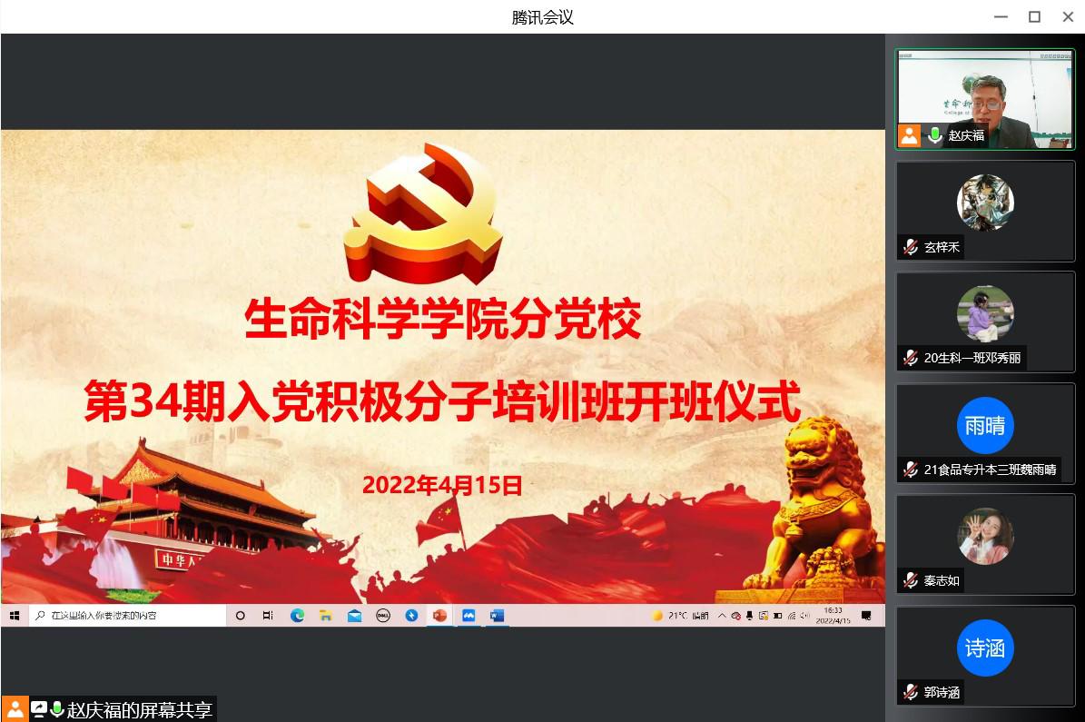 4月15日,欧美亚州国产日韩mv天天党委书记赵庆福通过腾讯会议主持召开了第34期入党积极分子培训班开班仪式。会上,赵书记对本次培训的指导思想、培训对象、培训目的、培训内容及考核方式进行了详细解读和具体阐述,并对学员们提出了两点要求,一是要珍惜此次培训机会,系统学习党的知识,了解党的政策、理论、方针、路线;二是按时上课、认真学习,为未来成为一名合格的共产党员打下坚实的基础。