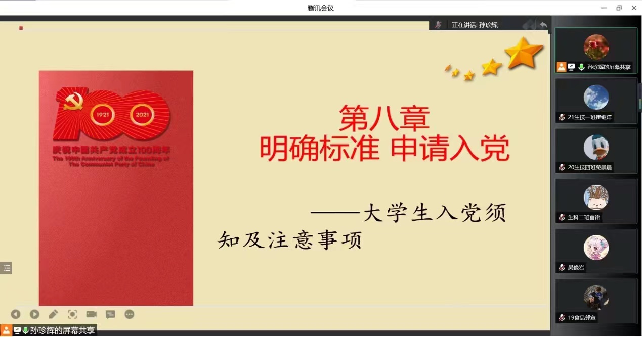 为提高入党积极分子们的党性修养,端正入党态度,明确入党动机。我院于2022年4月23日通过腾讯会议开展“明确标准,申请入党”入党积极分子线上培训课。此次课程由孙珍辉老师主持,欧美亚州国产日韩mv天天入党积极分子参加了此次培训。