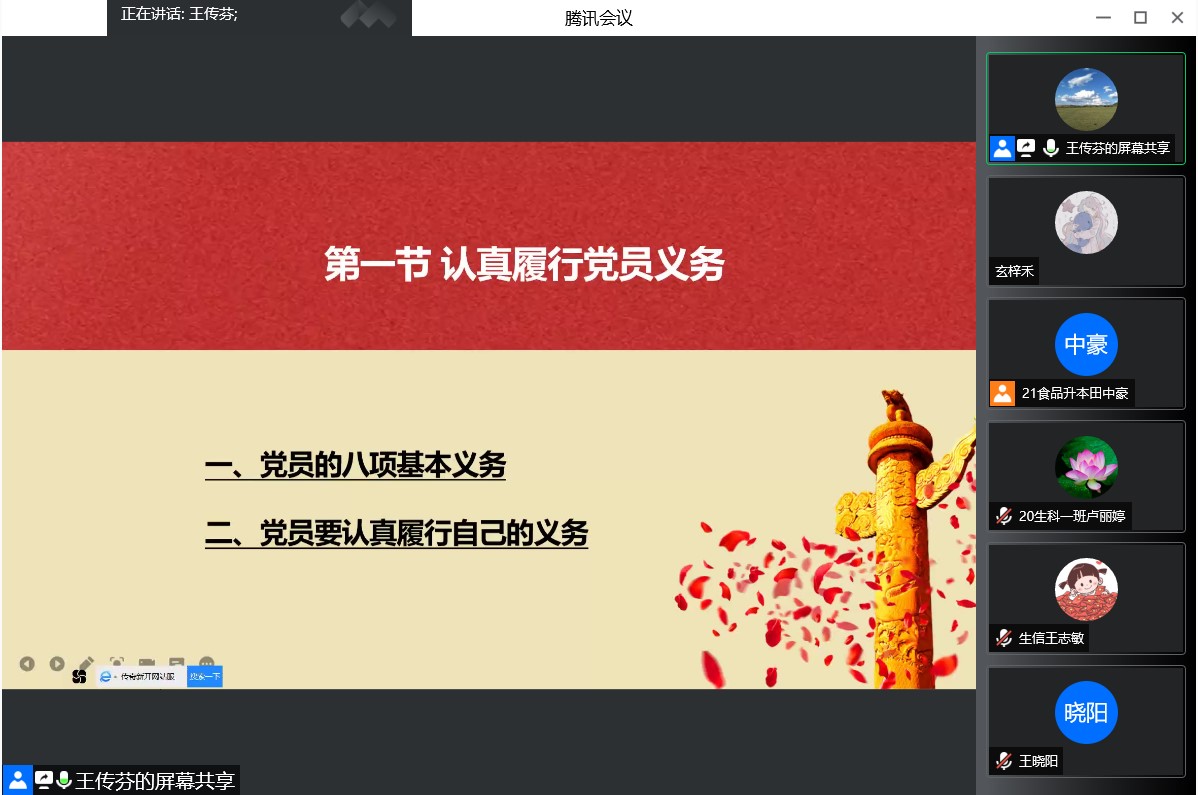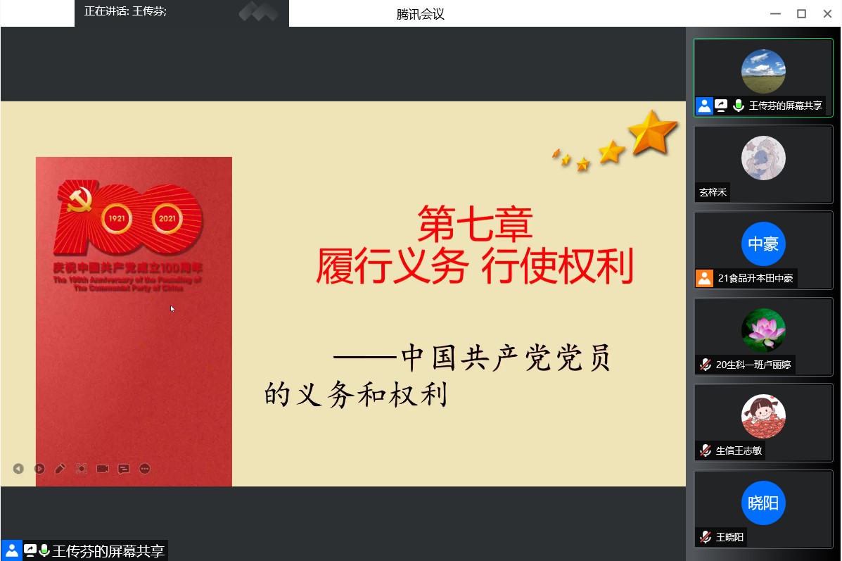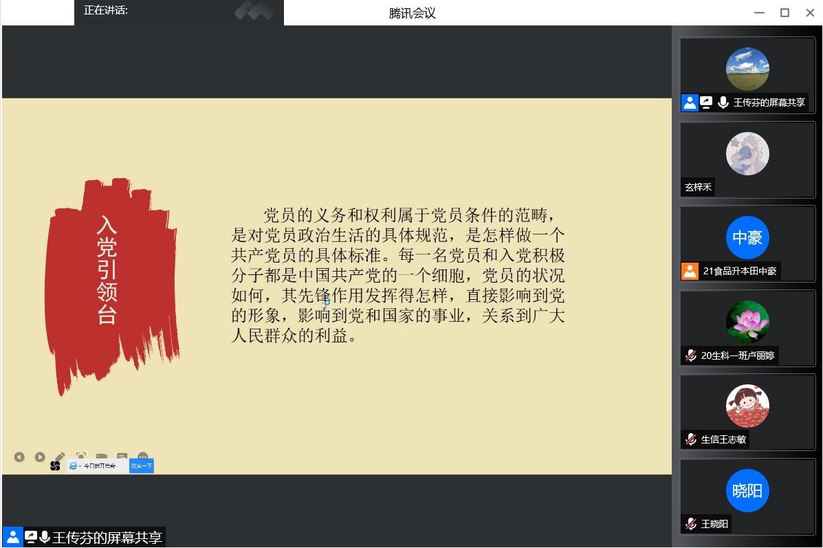 为使入党积极分子们认真履行党员义务,正确行使党员权利。我院于2022年4月22日通过腾讯会议开展“履行义务,行使权力”入党积极分子线上培训课。此次课程由王传芬老师主持,欧美亚州国产日韩mv天天入党积极分子参加了此次培训。