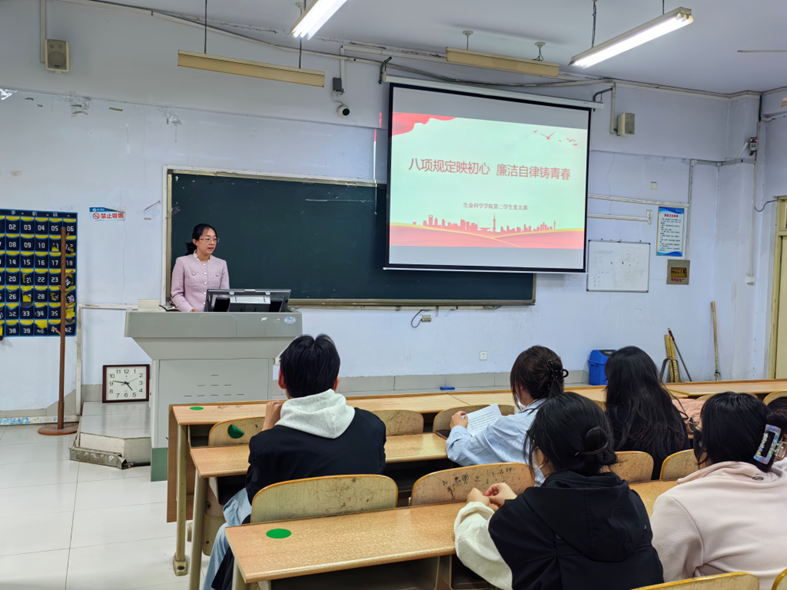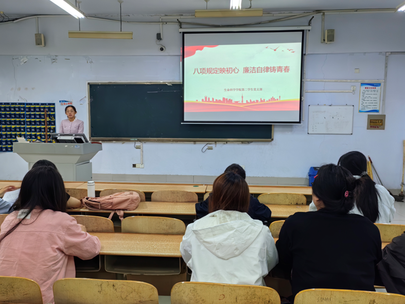 为深入学习贯彻中央八项规定精神,引导新时代大学生树立廉洁自律意识,欧美亚州国产日韩mv天天于4月15日在求实楼0105教室组织开展“八项规定映初心,廉洁自律铸青春”主题党课。本次党课由第二学生党支部书记郑金召讲授,全体学生党员参加此次学习。