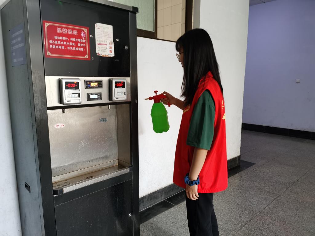 下午三点,志愿者们提前在教学楼门口集合,并配置好了消毒液,准备好了消毒工具。同学们手持消毒喷壶对教学楼饮水机进行喷洒消毒,将饮水机外机擦拭地干干净净。同学们分工明确、相互配合,大大的提高了清理饮水机的效率,为同学们提供一个健康舒适的饮水环境。本次活动去除了饮水机的各类污垢、细菌,有效阻止了各类细菌和病毒的传播,为同学们创造一个健康舒适的饮水环境,同时也倡导了新时代青年助人为乐、甘愿奉献的精神风貌,让同学们在实践中得到提升,在合作中得到锻炼。