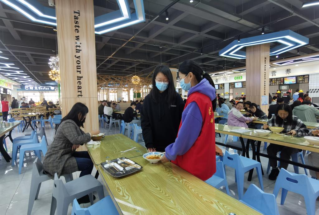 餐厅值班过程中,志愿者们身穿红色的志愿者服,在餐厅积极劝导用餐的同学们在饭后主动回收餐具,在排队期间养成不插队、不大声喧哗等良好行为。志愿者们在值班期间内每天都在规定的时间内到达值班地点,他们尽职尽责,认真巡逻。餐厅的工作人员表示:志愿者们帮助他们减轻了维持餐厅秩序的压力,同时饭后不回收餐具的现象也大量减少,因插队而引起的矛盾纠纷也大幅度降低。在餐厅就餐的同学们也表示本次餐厅值班志愿服务为他们提供了一个良好的用餐环境,让他们养成了一个良好的用餐习惯,他们非常感谢志愿者们为创建校园文明而贡献出的力量。