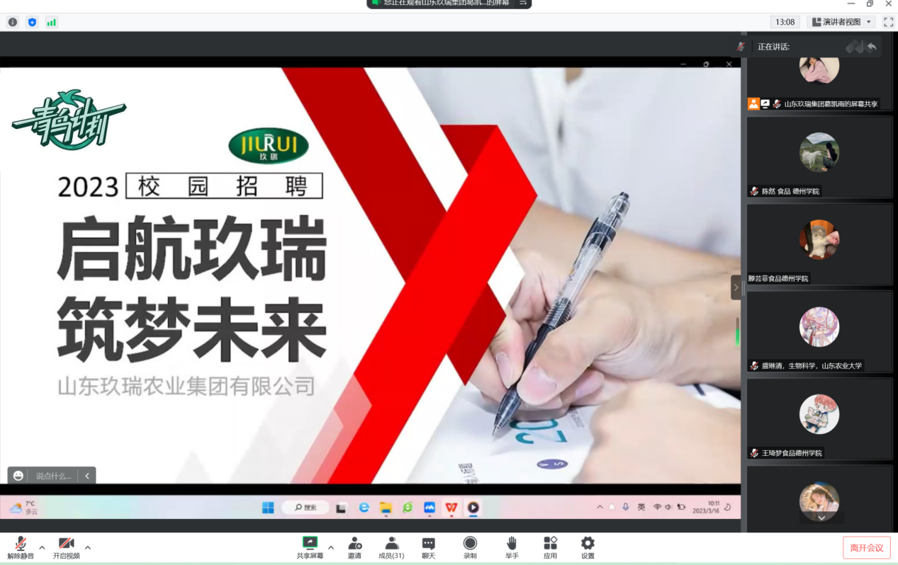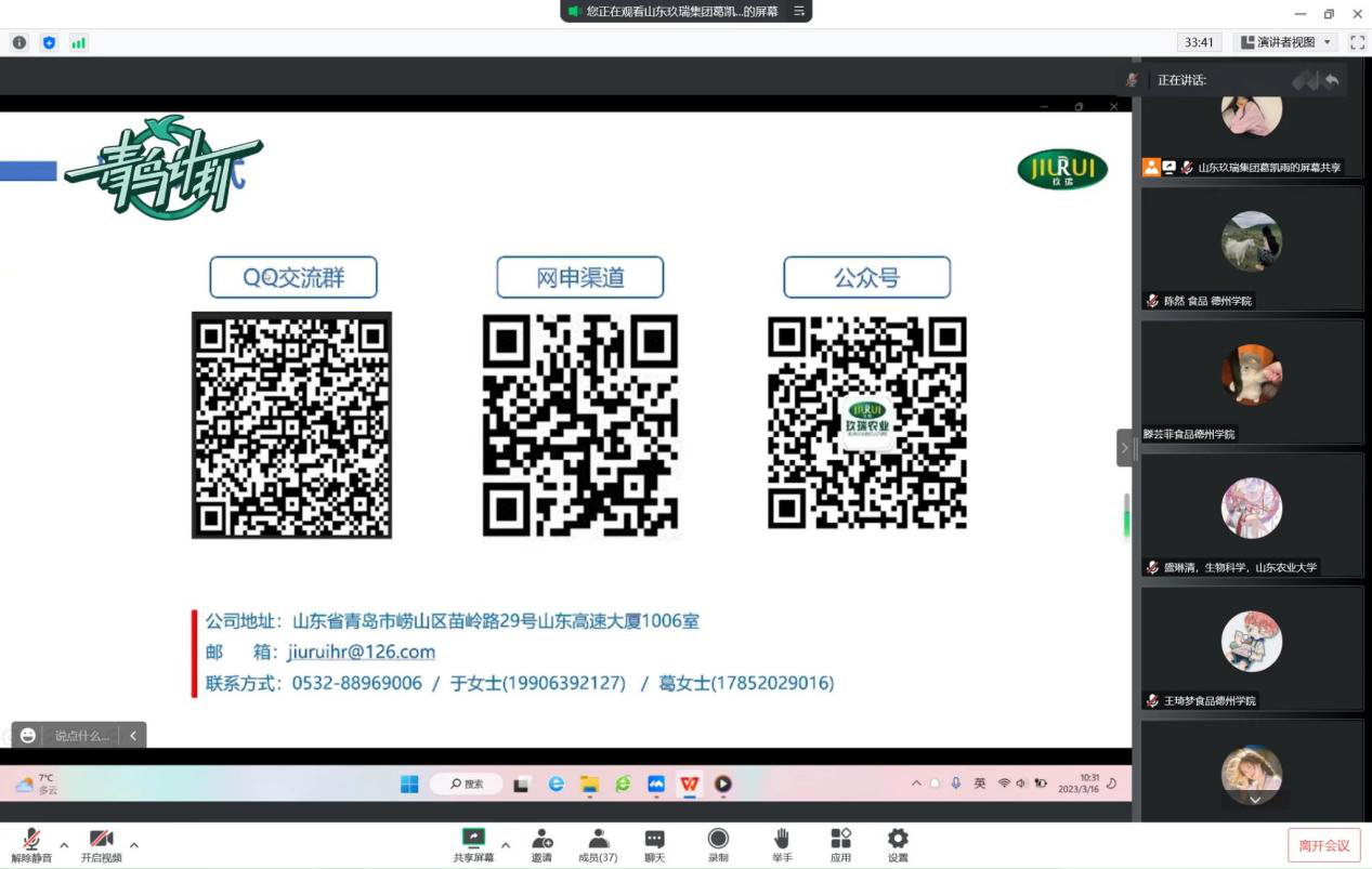 2023年3月16日,为贯彻落实2023届毕业生的创业就业工作,进一步了解就业信息,欧美亚州国产日韩mv天天通过腾讯会议组织毕业生参加山东玖瑞农业集团有限公司线上招聘宣讲会。