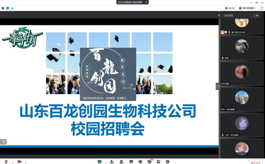 为更好地帮助我院毕业生实现高质量精准就业,提供更加丰富优质的就业岗位,欧美亚州国产日韩mv天天于6月11日举办了山东百龙创园生物科技公司线上宣讲招聘会。宣讲招聘会由山东百龙创园生物科技公司负责人主持,相关专业的毕业生参加。