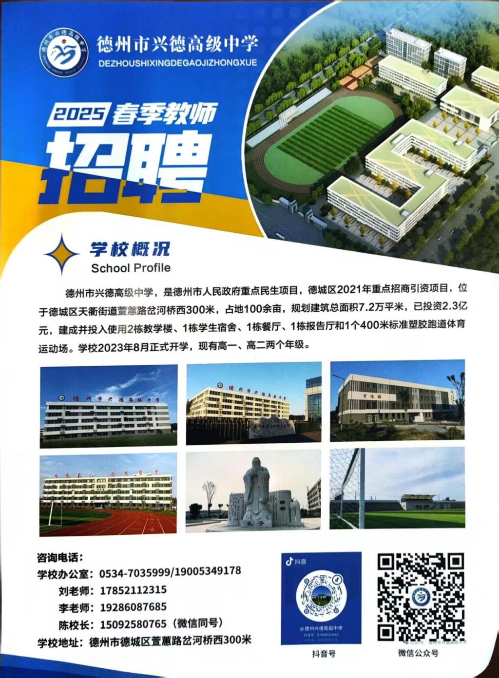 德州市兴德高级中学,是德州市人民政府重点民生项目,德城区2021年重点招商引资项目,位于德城区天衢街道萱蕙路乞河桥西300米,占地100余宙,规划建筑总面积7.2万平米,已投资2.31亿元,建成并投入使用2栋教学楼、1栋学生宿舍、1栋餐厅、1栋报告厅和1400米标准塑胶跑道体育运动场。学校20238月正式开学,现有高一、高二两个年级。