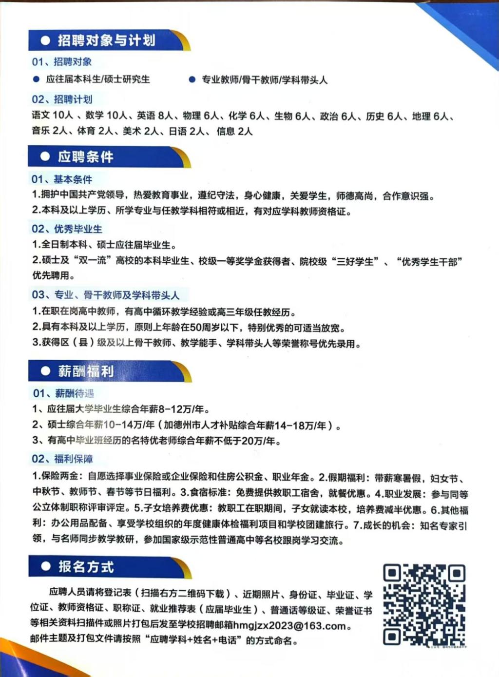 1.招聘岗位:语、数、英、物、化、生、政、史、地、日语教师